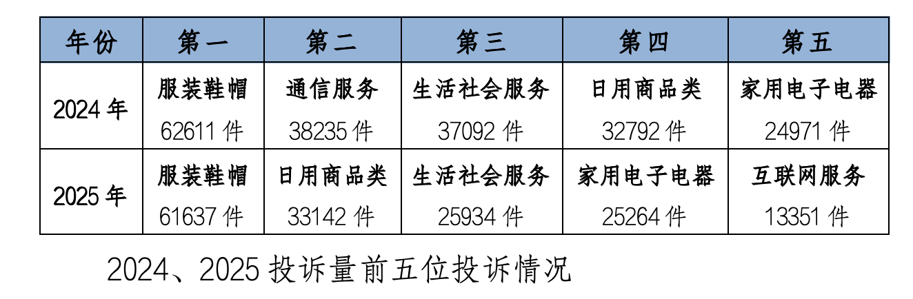 从投诉类别看,商品类投诉占总量的66.25%,占比进一步扩大。服装鞋帽类以61637件居首位,占总量的26.19%,主要涉及质量和售后问题。日用商品类和家用电子电器类分列二、四位,投诉量同比略有增长。服务类投诉中,生活社会服务类、互联网服务类和通信服务类位居前三。