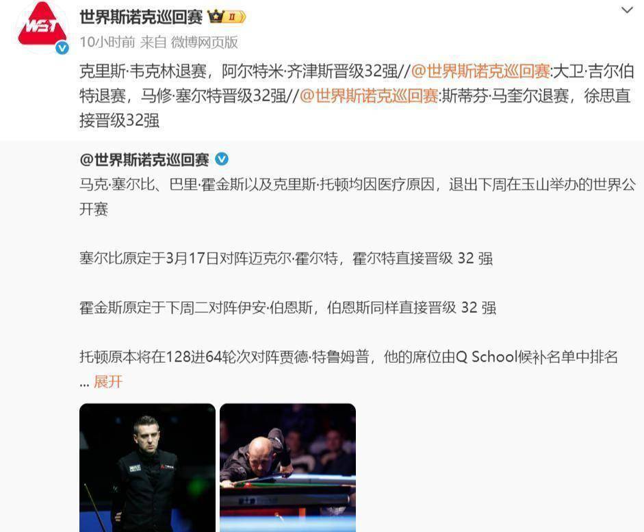 距离2026年斯诺克玉山世界公开赛正赛开杆仅剩四天,世界斯诺克巡回赛(WST)的官方公告却像一连串惊雷,炸响了原本平静的赛前氛围。 马克·塞尔比、巴里·霍金斯、克里斯·托顿,紧接着是斯蒂芬·马奎尔、大卫·吉尔伯特、克里斯·韦克林。