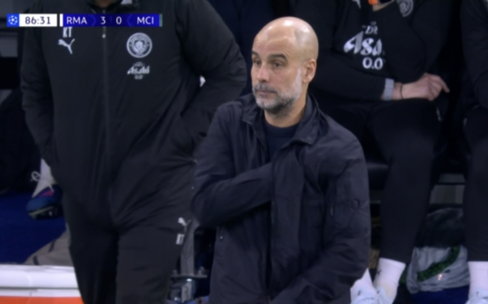 比赛最后时刻,曼城依旧大比分落后,场边的瓜迪奥拉显得很失望、很尴尬。